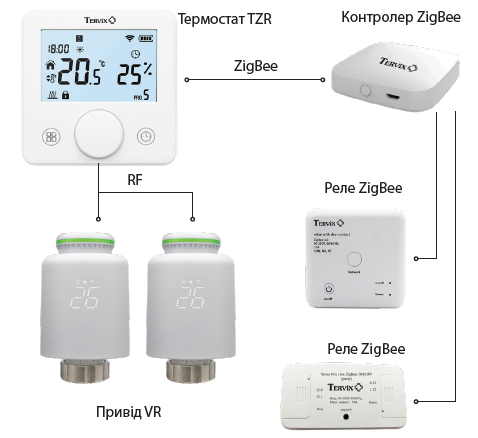 Термостат TZR підтримує два типи зв’язку — ZigBee та RF, завдяки чому легко інтегрується в різні системи опалення та працює з широким спектром обладнання.