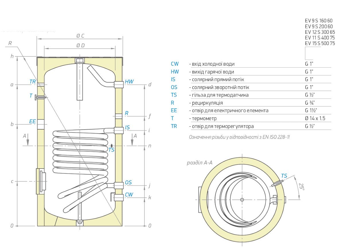 Накопительный водонагреватель TESY EV11S 400 75 F42 TP - напольный бойлер косвенного нагрева с баком цилиндрической формы из эмалированной стали, змеевидным теплообменником и аналоговым управлением.