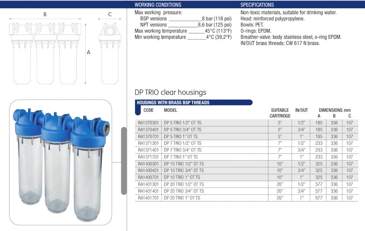Фільтри для води DP TRIO виробництва Atlas Filtri - це корпуси для фільтрації тристадійного очищення, які можна використовувати як із картриджами SX зі стандартними плоскими прокладками, так і зі спеціальними картриджами BX із швидкороз'ємним з'єднанням та подвійним кільцем ущільнювача. Правильне розташування картриджів SX забезпечується за допомогою системи центрування Filter-Fit.