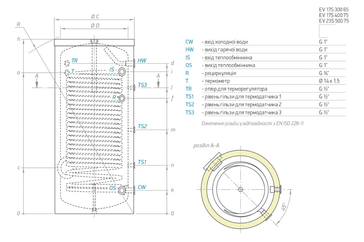 Накопичувальний водонагрівач Tesy EV 17S 300 65 F41 TP3 - підлоговий бойлер непрямого нагріву з баком циліндричної форми з емальованої сталі, змієподібним теплообмінником та аналоговим керуванням.