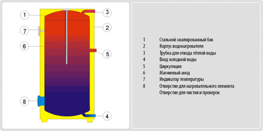 Резервуар водонагрівача зварений із сталевого листа та повністю покритий емаллю, стійкою до дії гарячої води. Як додатковий антикорозійний захист у верхній частині водонагрівача встановлений магнієвий анод, який регулює електричний потенціал внутрішньої частини ємності і таким чином зменшує небезпеку його іржавіння. У ємності приварені висновки гарячої води, холодної води та циркуляційний отвір. Під пластиковою кришкою на бічній поверхні водонагрівача об'ємом знаходиться очисний та оглядовий отвір з фланцем, в отворі можна встановити нагрівач з різною потужністю. Індикатор температури знаходиться на оболонці водонагрівача. Ізоляцію резервуара утворює шар поліуретанової піни завтовшки 50 мм. На водонагрівач одягнений пластиковий корпус (затверділий полістирол). Основна функція - Нагрів води для технічних та господарських цілей на об'єктах, підключених до електромереж із доступним зниженим (нічним) тарифом.